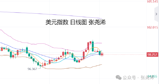 美元指数,日图昨日回落收跌至中轨及短期均线下方,空头力量有所增强,但周图走势仍处于支撑上方,且附图指标保持看涨信号发展,暗示后市前景仍有震荡调整或是继续回升走强,而限制了金价多头。但对于未来一年前景和仍有降息周期来看,美元的多头动力预计难以向上打破之前的2年左右的震荡区间,故此对于金价来说,目前看涨前景依然良好。